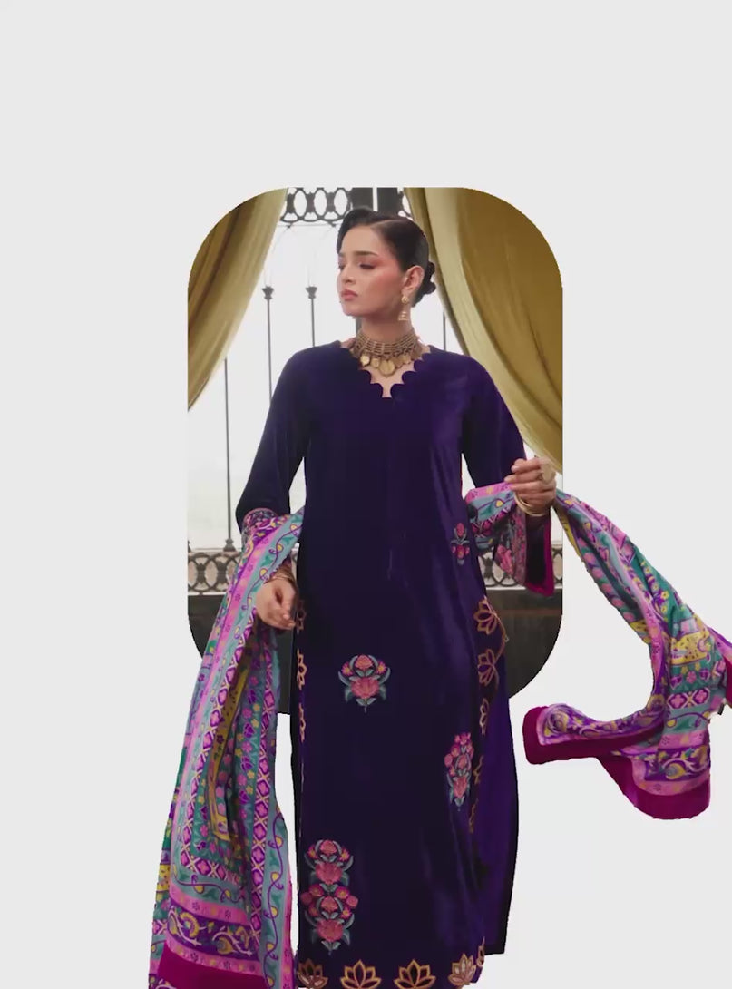 A luxurious creation where profound depth meets vibrant spectacle. Crafted from sumptuously soft Deep Royal Purple Velvet, the outfit offers a silhouette of sophisticated grace. It is dramatically elevated by a magnificent silk dupatta, a canvas of digitally printed artistry. Here, bold fuchsia, serene teal, and lush emerald intertwine with intricate floral embroidery, creating a dynamic visual symphony that perfectly complements the velvet's rich hue. This piece is a modern ode to traditional luxury, designed for the discerning individual who seeks an impactful and color-rich statement.