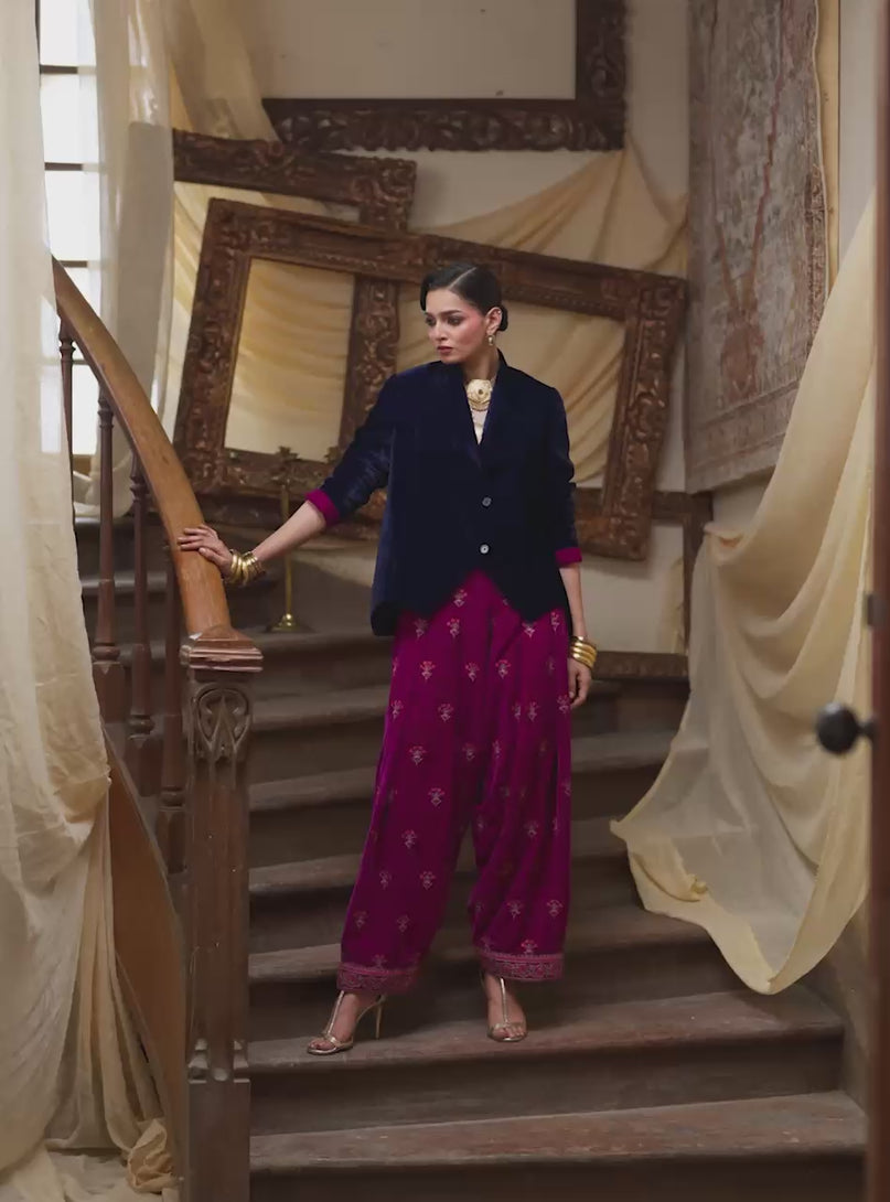 A sophisticated, high-fashion fusion ensemble perfect for making a bold statement. This striking piece features a tailored Deep Navy Blue velvet blazer jacket, designed with a sharp lapel and a subtle floral thread-work motif across the back for an unexpected touch of artistry. The modern tailoring beautifully contrasts with the traditional Magenta shalwar, which is richly adorned with intricate embroidery, showcasing a vibrant, festive energy.