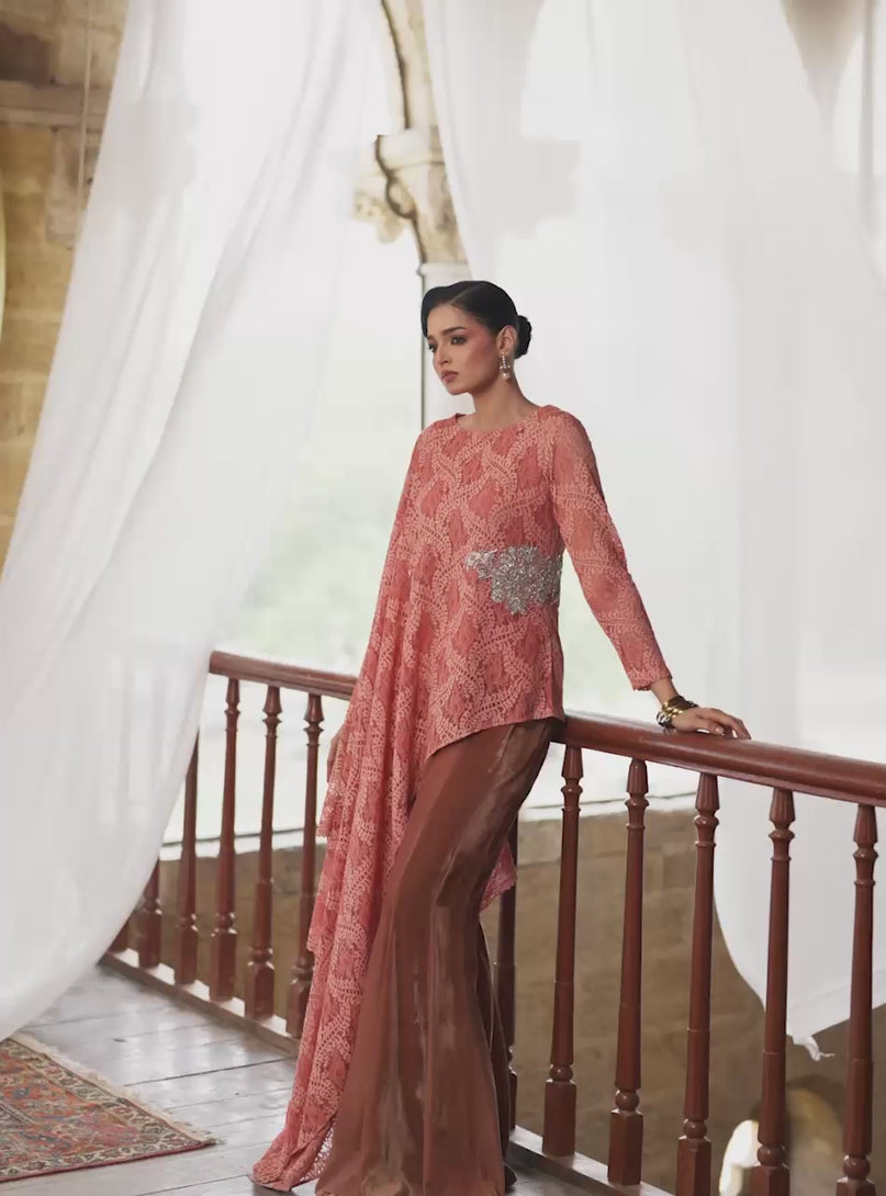 An outfit that makes you feel instantly light, confident, and utterly sophisticated. The top is cut in a fluid, cape silhouette from a delicate Blush-Toned Chantilly Lace which drapes beautifully and gives your movement an ethereal quality. This soft texture is elegantly grounded by a striking silver hand-embellished, placed to define your waist with a precious shimmer. Paired with perfectly tailored flared trousers in a rich, complementary rust tone.