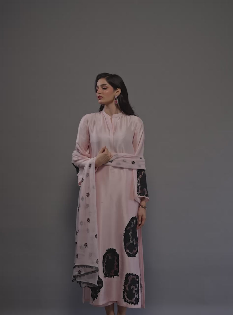 The long shirt is meticulously crafted from premium fabric, serving as a serene backdrop for dramatic, hand-placed black floral lace appliqués that create a striking visual rhythm across the hem and sleeves. This masterful contrast is mirrored in the matching dupatta, which features delicate embroidery and a refined lace border, perfectly pulling the look together. Paired with graceful wide-leg trousers, this outfit is the epitome of modern luxury, offering a poised and unforgettable aesthetic for your most cherished Eid celebrations.