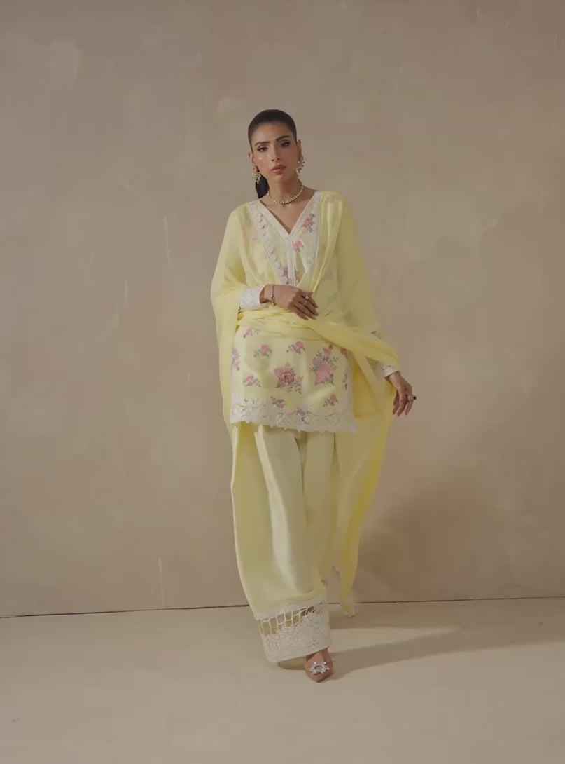 Brighten up your Eid festivities with butter yellow bloom. This luminous butter yellow raw Silk ensemble features an all-over tapestry of pink and magenta floral bouquets. The hem is adorned with exquisite white laser-cut lace corners that create a high-fashion, airy finish. Paired with a matching chiffon dupatta and Silk pants, this outfit is a vibrant choice for any daytime celebration.