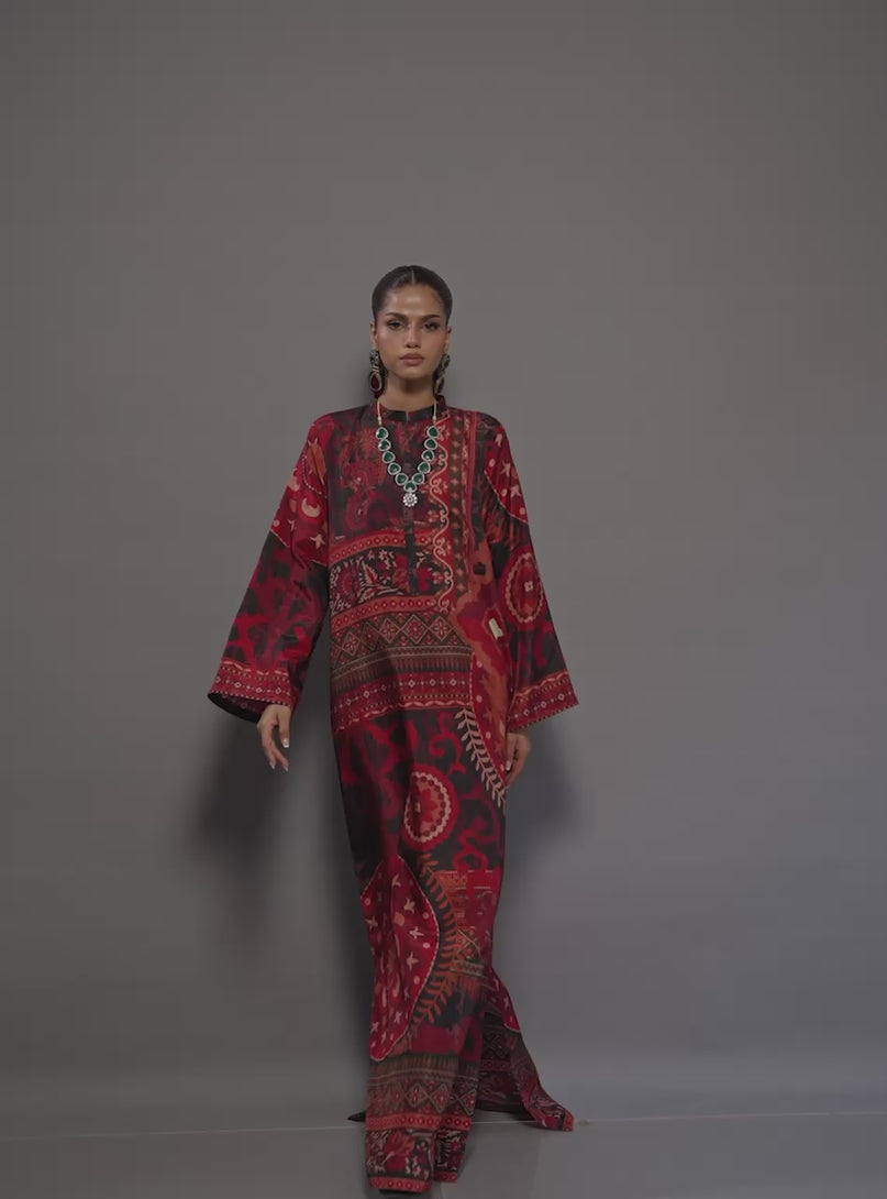 This kaftan is a flowing silhouette that drapes beautifully, offering a relaxed yet regal look. Drenched in a rich, multi-tonal print of earthy ochres, deep teals, and sunset reds, the kaftan is adorned with intricate traditional and geometric printed borders. The wide sleeves and floor-length cut provide a dramatic sense of movement, making it the perfect choice for an effortless Eid transition from daytime elegance to evening glamour.