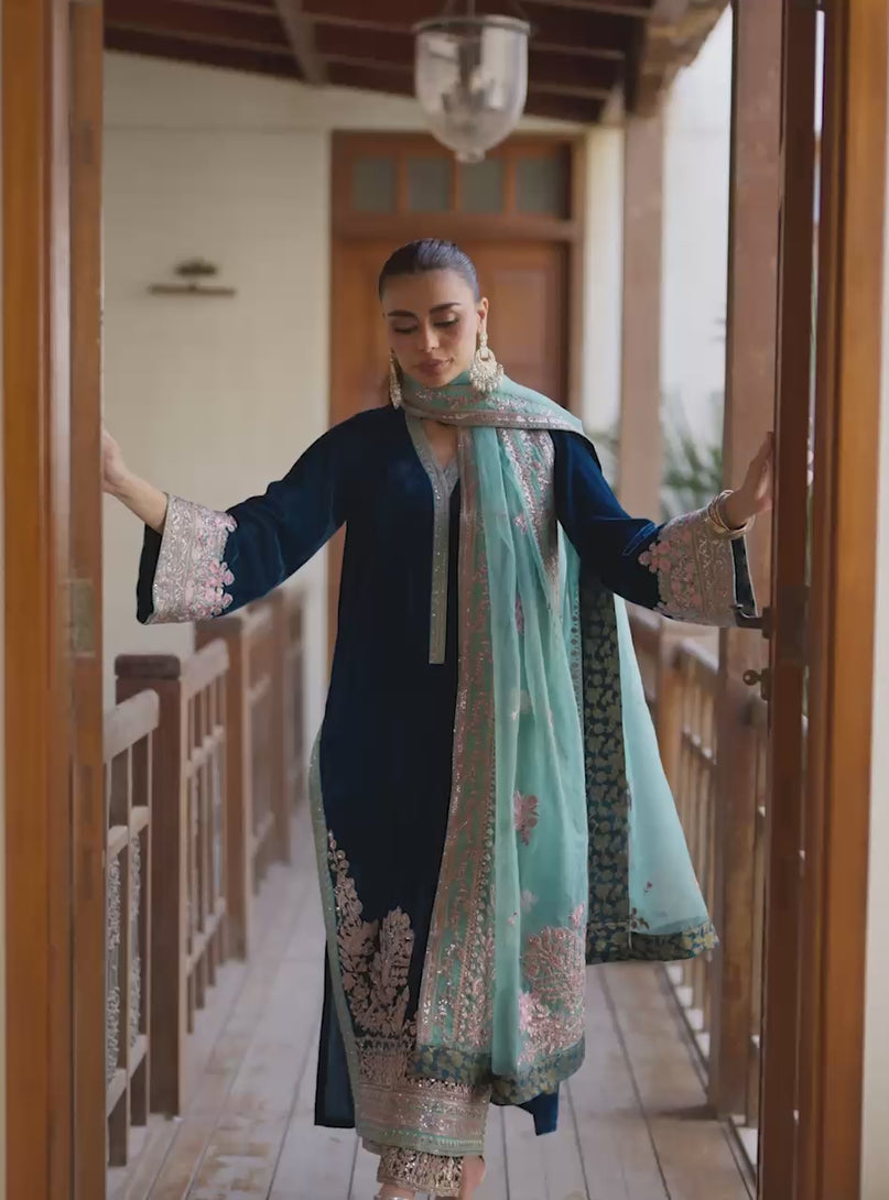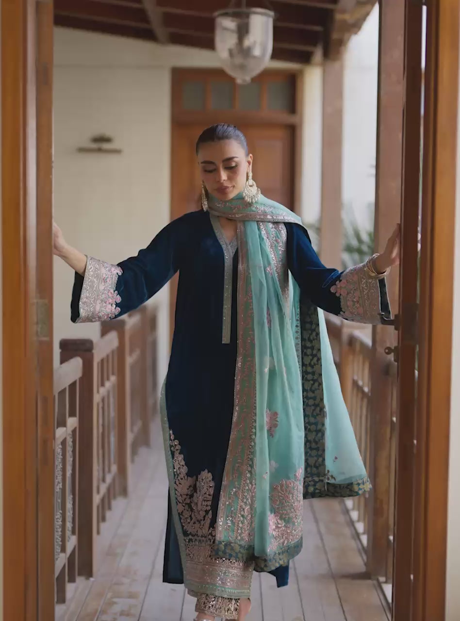 An ethereal and elegant three-piece suit in deep Teal Velvet. The shirt features heavy antique silver and gold thread-work embroidery concentrated on the hemline and wide cuffs. Paired with matching raw silk trousers and a stunning Aqua/Mint Organza Dupatta, which offers a refreshing contrast with its sprawling floral work and heavily detailed silver border.