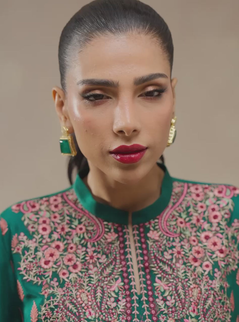 Make a grand entrance in Emerald Muse, a masterpiece of traditional aesthetic and modern luxury. Set against a deep, lustrous forest green canvas, this ensemble features an intensely detailed embroidered "gala" in shades of rose and pearl. The Kaftan is adorned with an all-over patterned motif, leading to a sprawling botanical border that adds weight and grace to the silhouette.