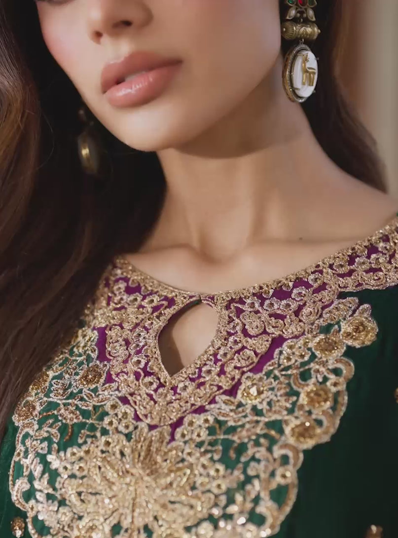 A luxurious three-piece suit crafted from opulent Emerald Green Velvet. The shirt and trousers are adorned with rich, intricate hand-embroidery in gold and rust tones along the neckline, sleeves, and wide borders. This majestic design is finished with a striking Deep Purple Organza Dupatta featuring scattered motifs and a heavily embroidered contrast border.