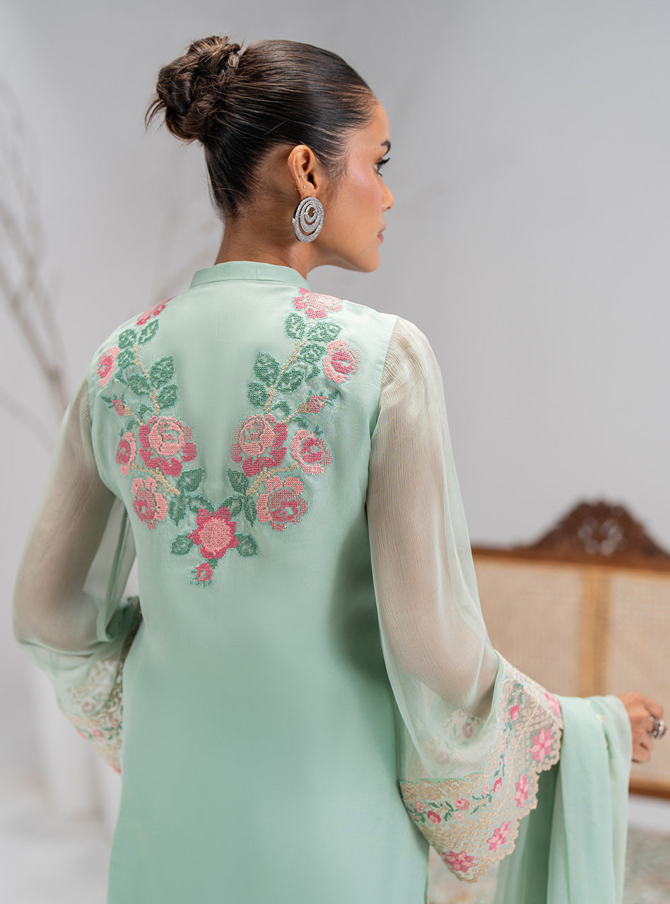This breathtaking mint green outfit is crafted from the most beautiful, flowy fabric, chiffon, making you feel elegant and comfortable all day long. The chic, short shirt silhouette offers a modern yet graceful look, perfectly complemented by delicate floral embroidery with soft pink and green flowers that wind around the neck, sleeves, and hem. Complete with its lovely dupatta and perfectly matched shalwar.