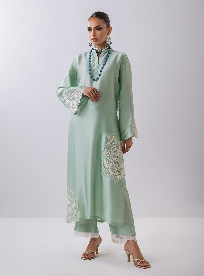 Turn your look with this exquisite mint kantha work dupatta, which is meticulously crafted to add artisanal charm to any outfit. The intricate kantha embroidery exudes cultural richness, while the refreshing mint hue provides a sense of calm and freshness. Paired with a long mint cutwork shirt with delicate detailing on hem that exudes elegance and grace, and straight pants for a sleek, tailored look. This ensemble is a celebration of classic and modern elegance.