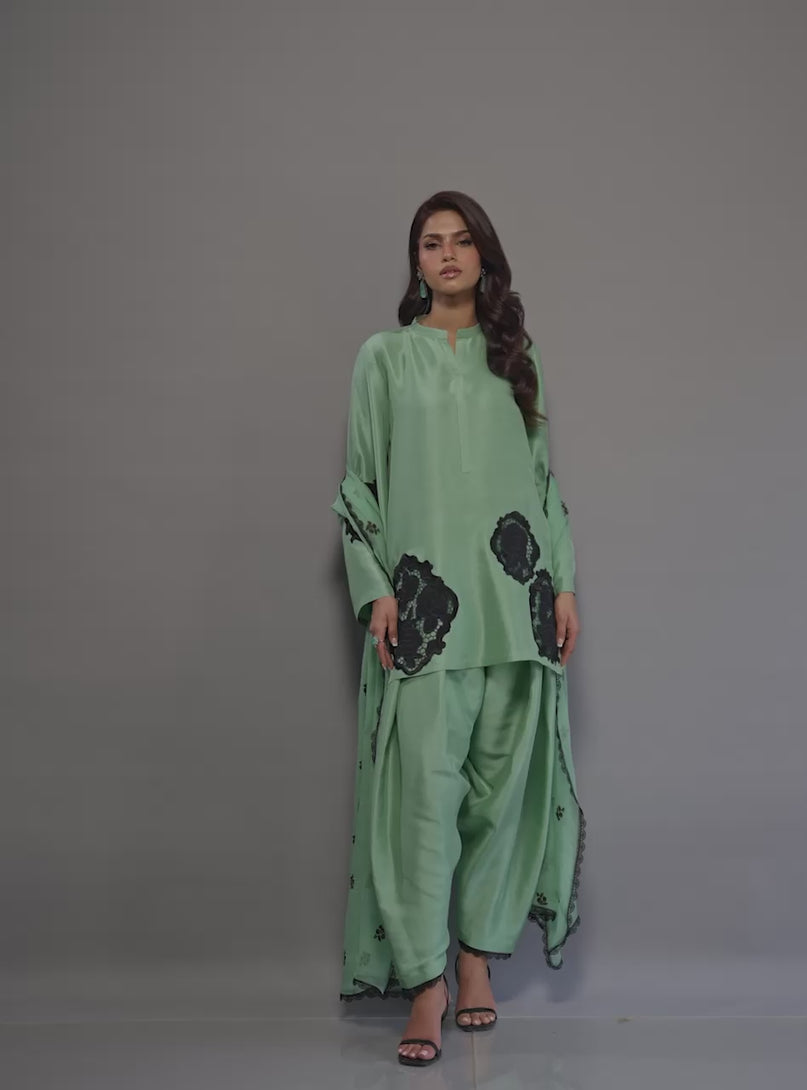 Exude contemporary charm in this refreshing mint green ensemble. The chic, short shirt is highlighted by bold, black floral applique motifs that make a striking statement on the side and sleeves. It is paired with a comfortable, matching shalwar for a modern silhouette. The look is completed with a lightweight dupatta featuring scattered small black embroidered motifs and a delicate black lace border, making it a perfect, stylish choice for daytime festive events.