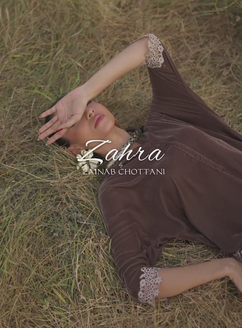 This Mocha Moment co-ord is giving luxury without the fuss. It's crafted from the softest velvet that feels like a hug, ensuring you're warm and looking snatched. The drop-shoulder kurta features a minimal placket and is perfectly finished with that swoon-worthy, intricate Cottagecore Glaze lace on the hem and sleeves. Paired with comfy velvet shalwar bottoms, this set is proof that you can be effortlessly chic, whether you're cozying up by the fire or slaying at your next winter soirée.