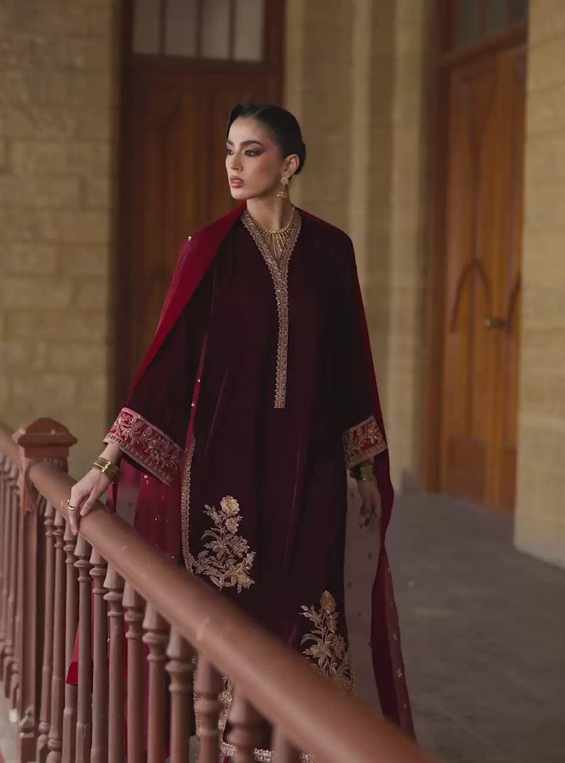A magnificent three-piece ensemble crafted from sumptuously rich Maroon velvet. This regal piece features a classic, straight-cut kurta, elegantly adorned with intricate gold tilla embroidery that gracefully outlines the neckline and frames the cuffs in a traditional, ornate pattern. A breathtaking, sprawling gold floral motif dramatically highlights the back of the kurta, ensuring a stunning impression from every angle. It is perfectly paired with red ijar, completing the luxurious silhouette, and a delicate gold-sequined organza dupatta that adds a touch of ethereal shimmer.