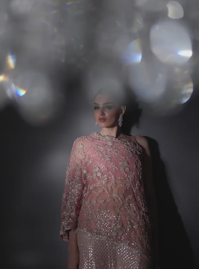 The stunning, one-shoulder tunic drapes elegantly and is exquisitely hand-embellished with floral vines and scattered crystal work, creating a sheer, gossamer effect that catches the light beautifully. This modern top is perfectly balanced by a high-waisted, flared trouser or gharara style bottom, which is entirely blanketed in shimmering sequin work that transitions from rose gold to a softer, metallic pink, resulting in a dramatic, fluid brilliance as the wearer moves, making it the epitome of subtle, fresh glamour.