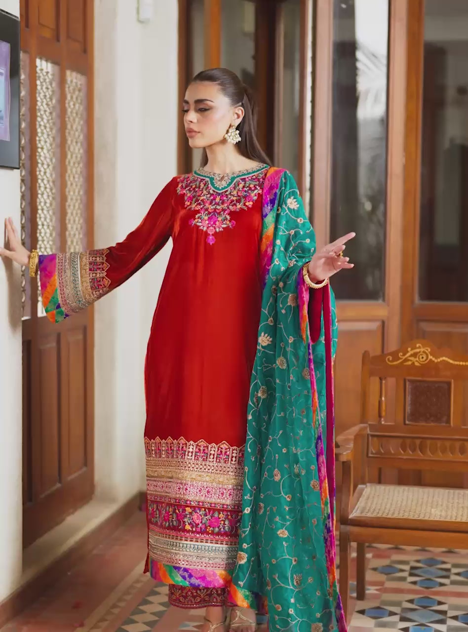 A luxurious three-piece in warm Rust Red Velvet. The shirt features a richly detailed multicolored embroidery on the neckline and a broad, intricate hem border in a medley of traditional colors. Paired with coordinating raw silk trousers and a breathtaking Turquoise Organza Dupatta with embroidered motifs and a lively border.