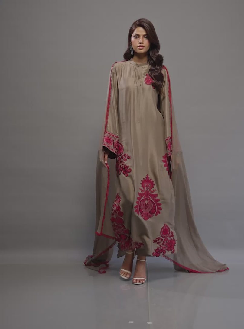 Exude an air of refined grace in this stunning taupe ensemble, a perfect fusion of muted elegance and fiery artisanal detail. The long shirt is meticulously crafted with a clean band collar and a hidden placket, serving as a sophisticated canvas for the bold, crimson-red embroidery that anchors the hem with majestic Suzani motifs. Intricate floral sprays adorn the shoulder and back, while the wide statement cuffs feature dense, traditional threadwork that adds a layer of heritage charm. Completed with a matching pants and a lightweight dupatta finished with a delicate red lace.