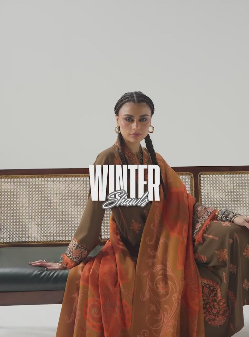 Zuri is an ode to the earth's timeless beauty, crafted in rich, grounding tones. The deep, warm brown Marina Twill suit provides a sophisticated canvas, subtly adorned with delicate tribal-inspired embroidery on the sleeves. This subdued elegance is dramatically elevated by the exquisite Lenzing Ecovero shawl, which blooms with an intricate tapestry of patterns in vibrant oranges, deep rusts, and warm terracotta. The shawl drapes with an inviting warmth, creating a harmonious blend of understated luxury and bold artistic expression.